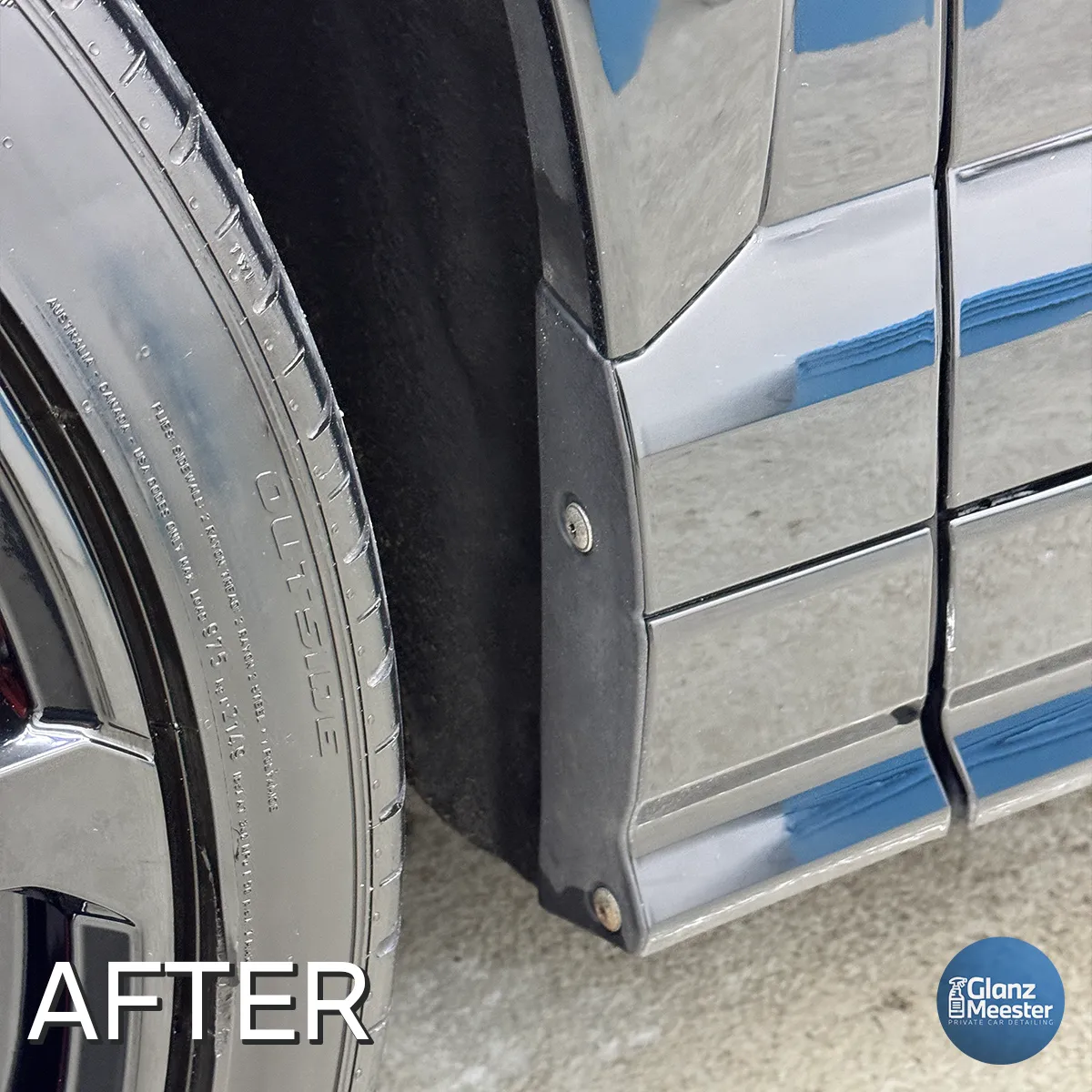 Na het polijsten brachten we een tire shine aan voor een frisse look, reinigden we de ramen en poetsten we de uitlaateindstukken. Omdat de Lamborghini binnenkort opnieuw wordt gewrapt, hebben we bewust geen keramische coating aangebracht.
