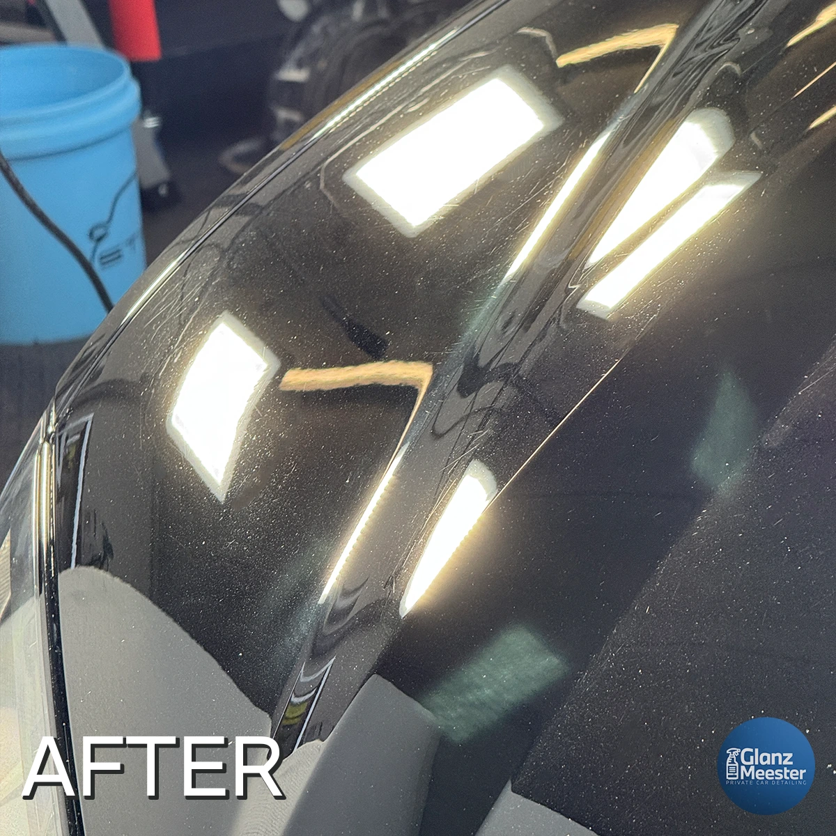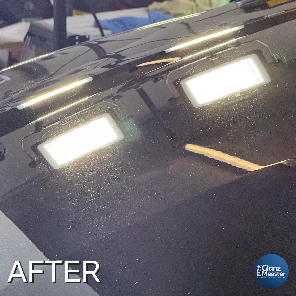 Met de lak vrij van alle vervuiling begonnen we aan het polijsten. Polijsten is een verfijnde techniek waarbij een dunne laag van de lak wordt verwijderd om kleine krasjes en swirls te elimineren. Dit maakt het lakoppervlak egaal, wat zorgt voor optimale lichtreflectie en een diepe glans.