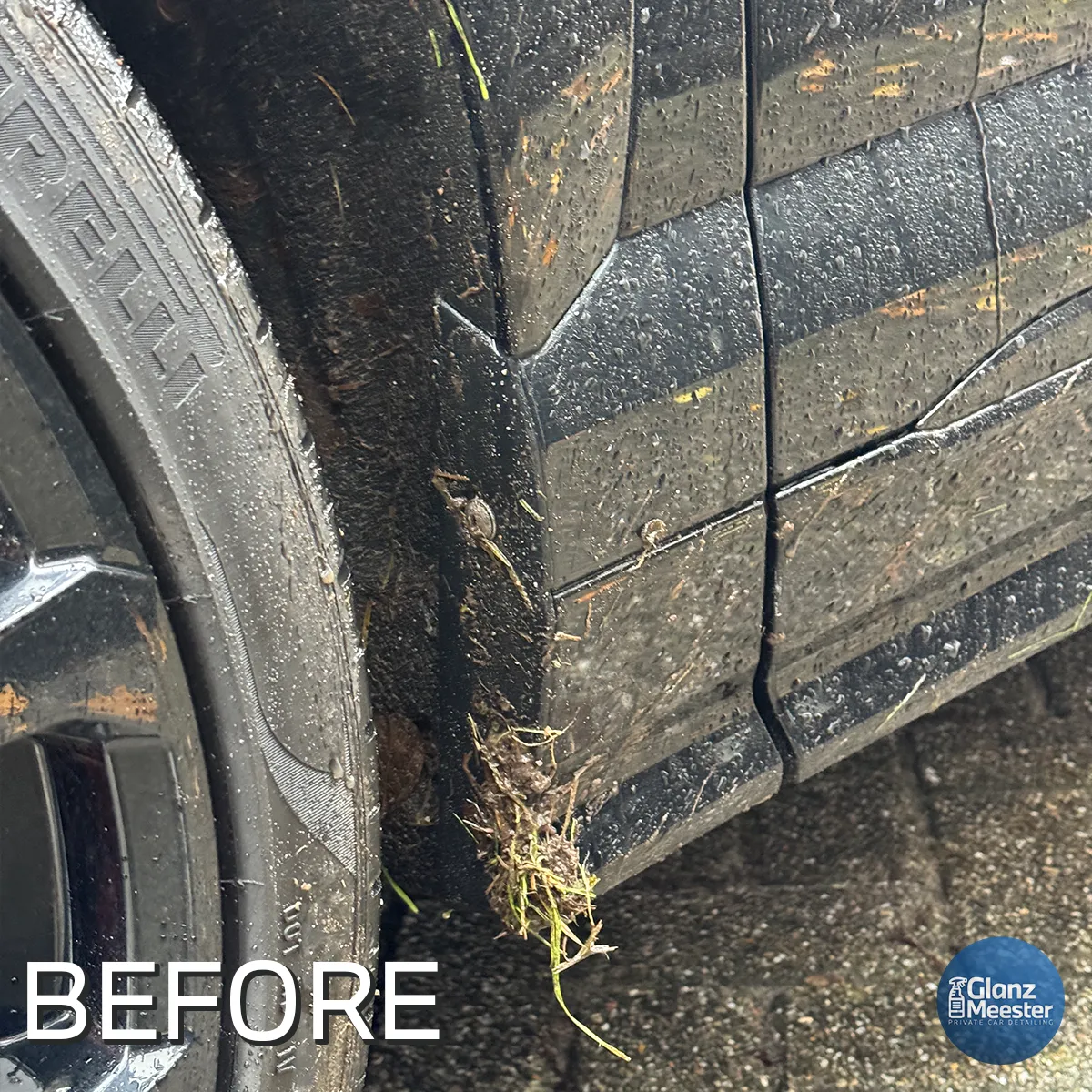 We zijn gestart met het reinigen van de velgen, wielkasten en banden. Wielen verzamelen het meeste vuil, zoals remstof en wegvuil, en dit kan tijdens het wassen op de lak terechtkomen. Dit willen we voorkomen, omdat vuil in een washandschoen of spons krassen kan veroorzaken.