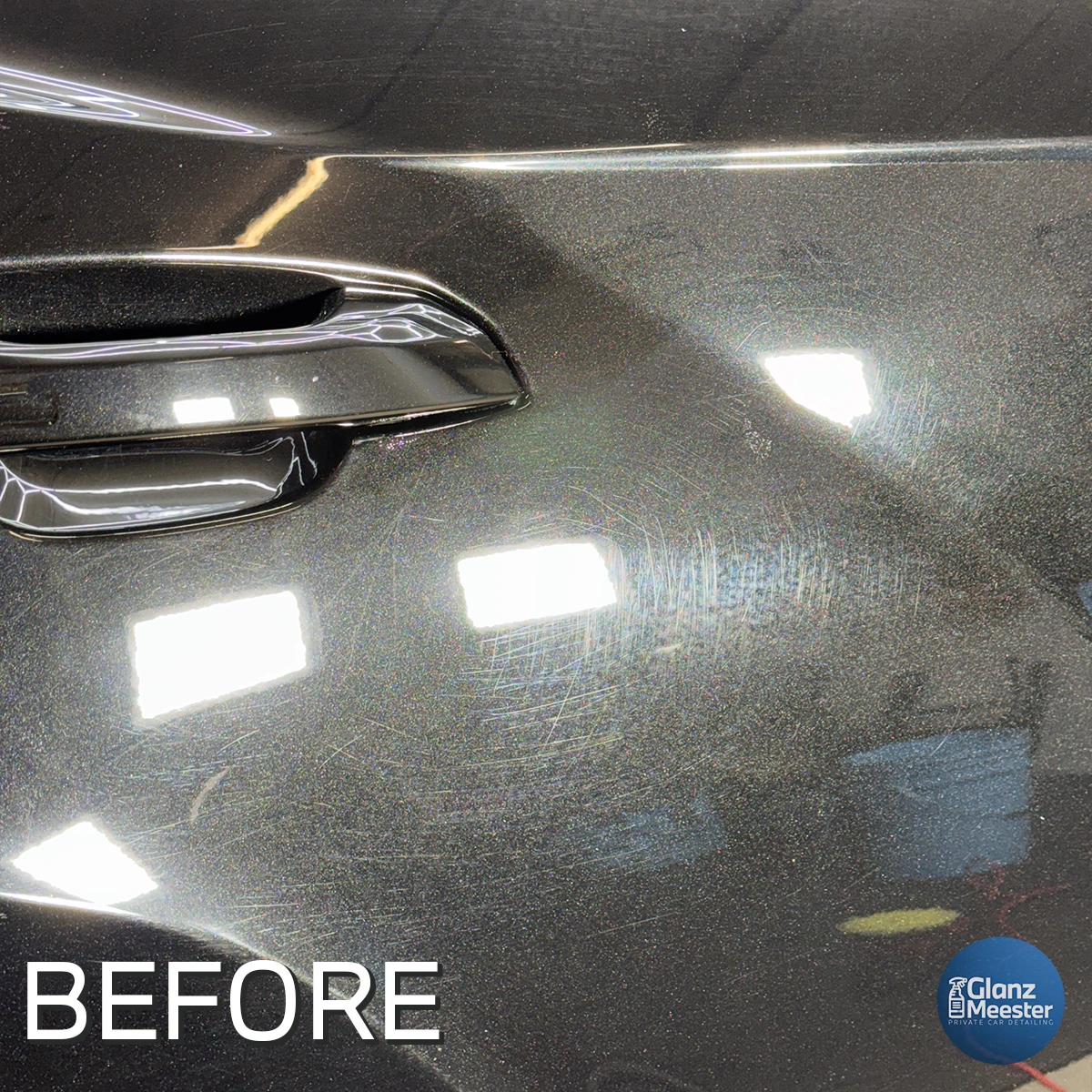 De Lamborghini Urus arriveerde bij ons met diepe krassen en talloze swirls. Swirls zijn kleine, ronde krasjes die in fel licht (zoals direct zonlicht) goed zichtbaar worden. Ze vormen dunne, cirkelvormige patronen en ontstaan meestal door de wasstraat of onjuiste was en poetsmethodes. Daarnaast was de auto recent ontdaan van een wrap, en door de vele scherpe hoeken en randen van deze bijzondere SUV waren er nog veel lijmresten en kleine stukjes wrap achtergebleven.